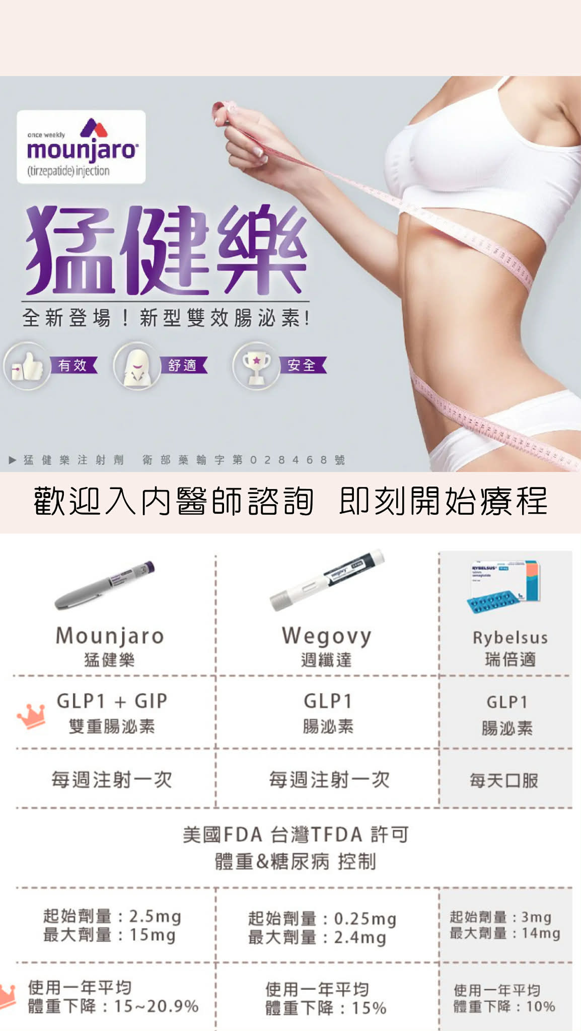 體重管理與血糖控制需依個人身體狀況進行專業評估。 本院提供猛健樂 Mounjaro(tirzepatide)之門診諮詢服務, 由醫師評估是否適合,並規劃完整的體重與代謝管理策略。 猛健樂屬於雙重腸泌素相關治療藥物, 實際療程與用藥方式須由醫師面診後決定。 ※ 本內容為醫療衛教資訊,非個人醫療建議。